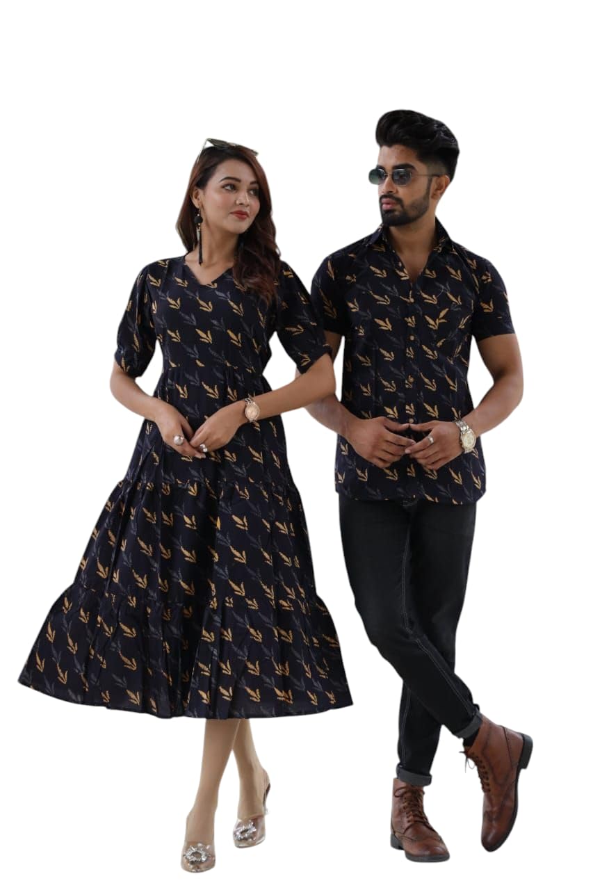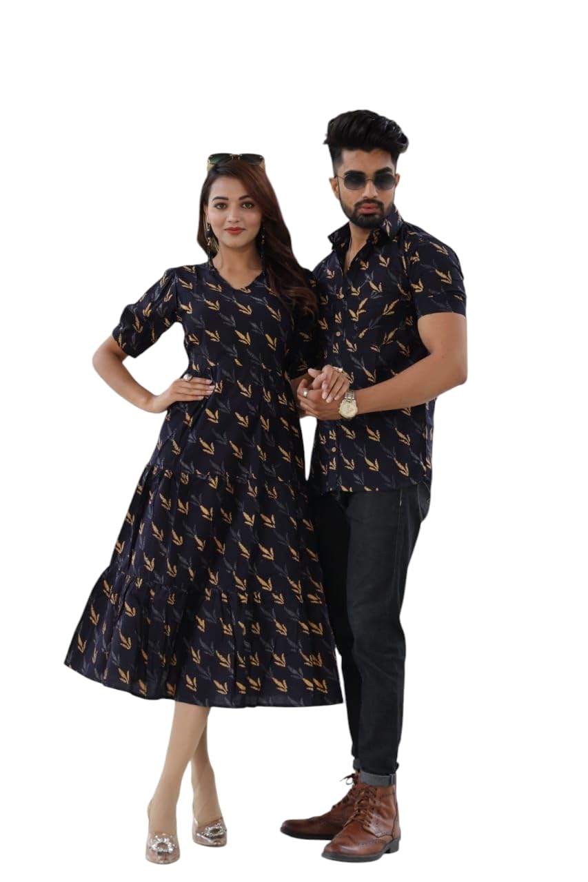 • MATCHING SET: Elegant navy blue coordinated couple outfit featuring a midi dress for women and short-sleeve shirt for men with golden leaf pattern print